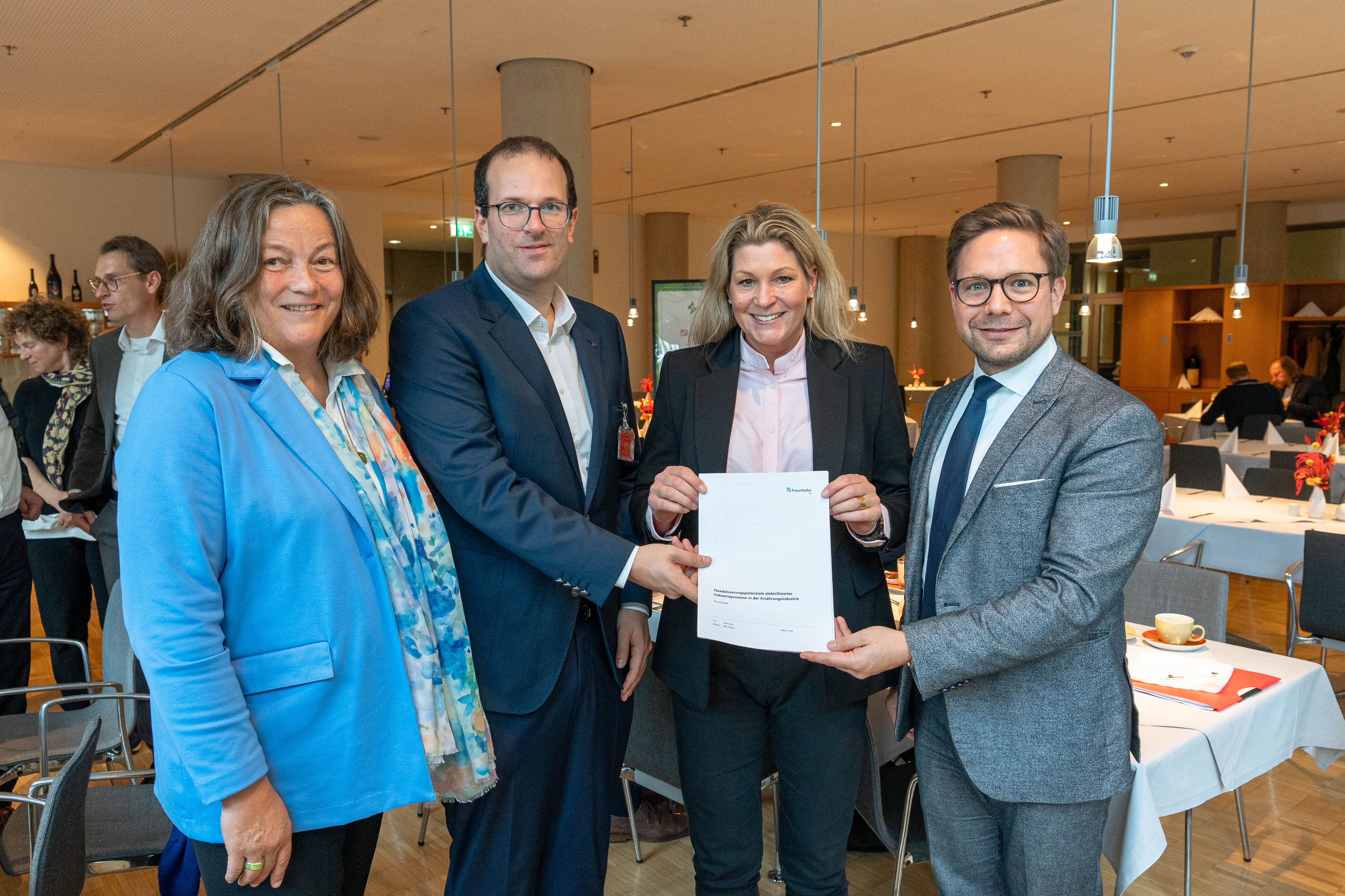 Pressefoto - Übergabe der Studie im Bundestag - v.l.n.r.: Jaana Kleinschmit von Lengefeld (OVID), Michael Haendel (Fraunhofer ISI), Julia Laudenbach (VGMS), Fabian Gramling (MdB) © OVID)